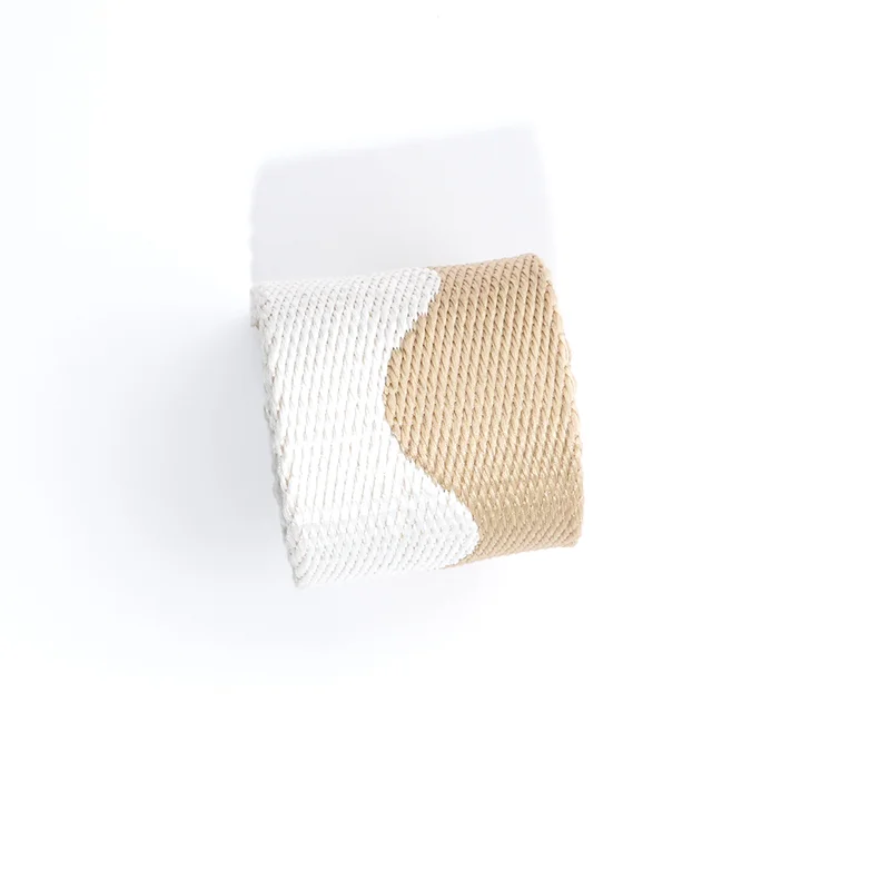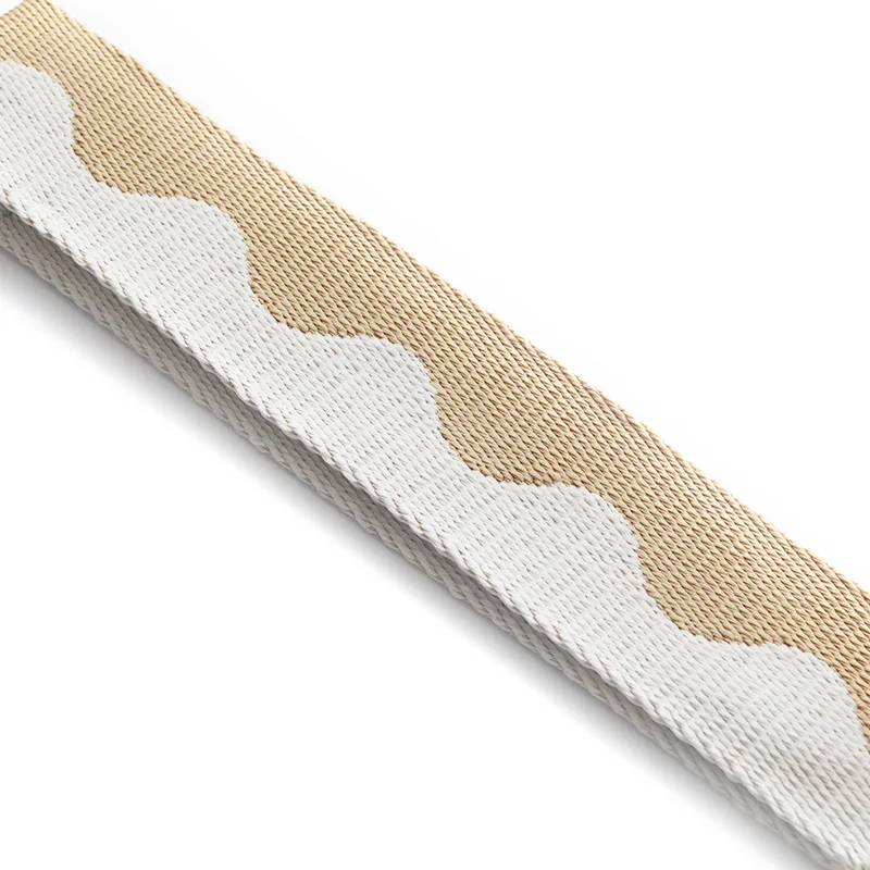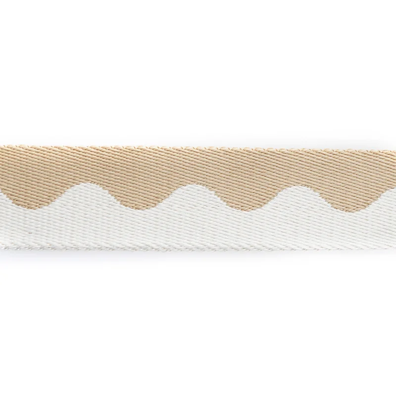 - 图案设计:核心为连续波浪纹(水波纹 / 弧形纹),沿织带长度方向呈 S 型流畅交替,白色波浪纹与卡其色基底交错,视觉灵动柔和,打破纯色织带的单调感。