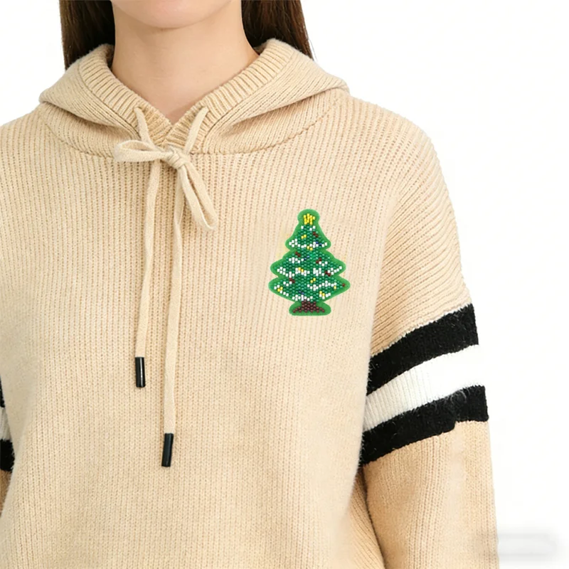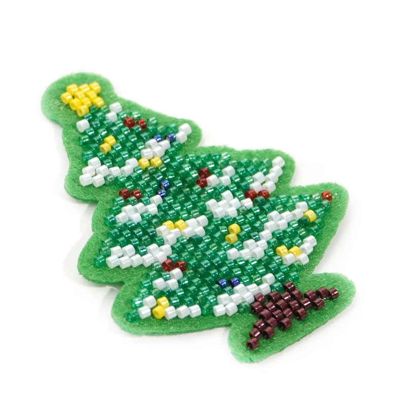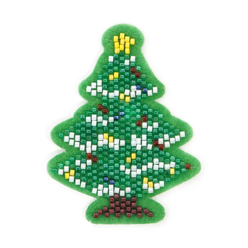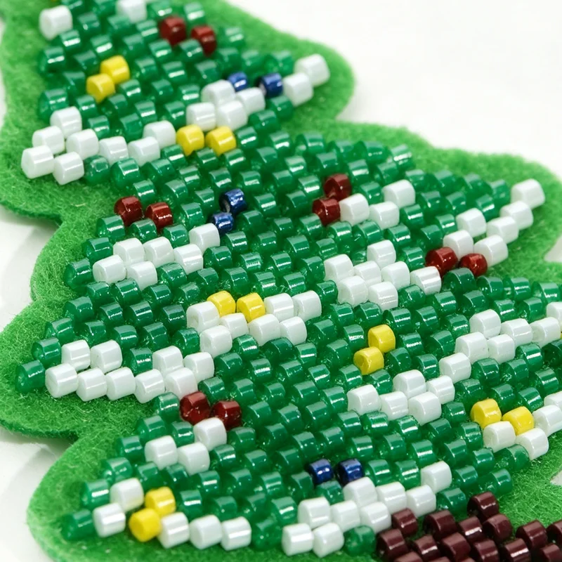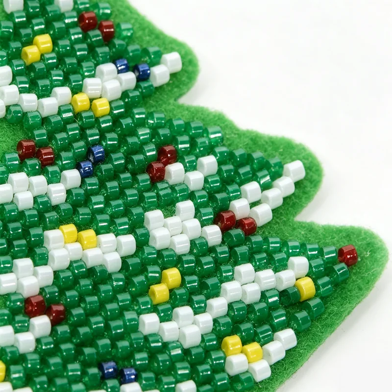 将多色圆柱形玻璃米珠逐一缝制,通过不同颜色珠子的拼合组成圣诞树装饰图案,形成 blingbling 的闪光质感,工艺精细,颗粒感强。 材质细节: 珠子:主体为草绿色米珠(构成圣诞树底色),树顶用黄色米珠做星饰;树枝点缀白色 / 银色米珠、深蓝色珠、酒红 / 深红珠,模拟彩灯与装饰球效果;树底用深棕 / 酒红珠子做树干装饰,色彩丰富,节日氛围拉满。