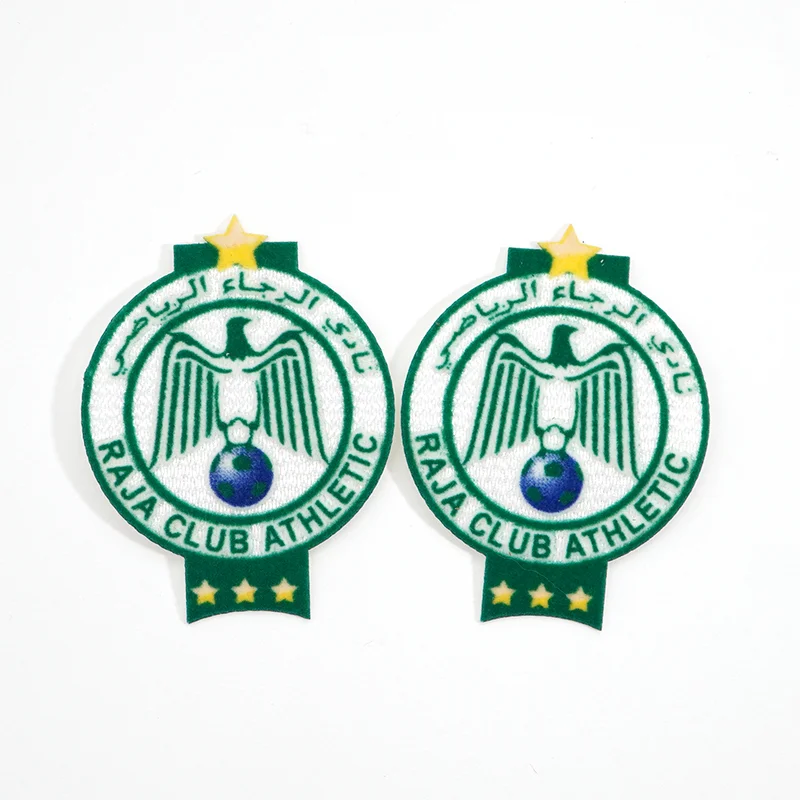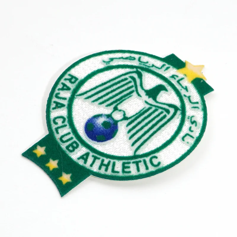 植绒工艺使图案呈现出柔软且立体的触感,相比普通印刷更加高级。深绿色文字与图案在白色底布上形成鲜明对比,同时蓝色足球与黄色星星增强视觉亮点。