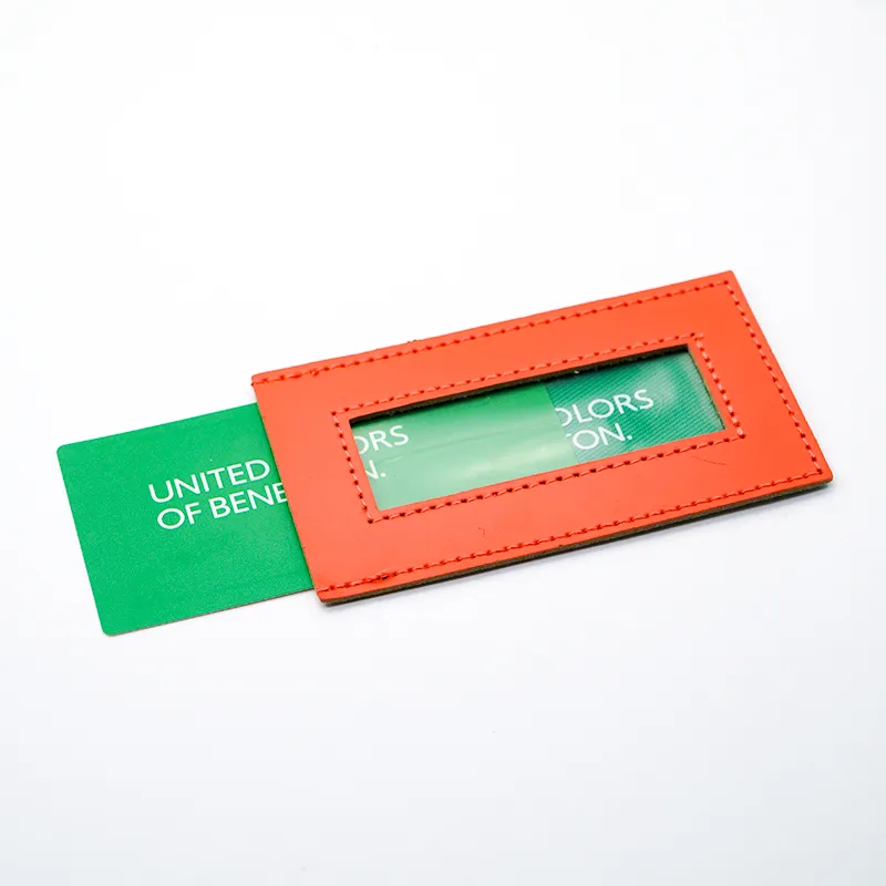 本款皮革吊牌专为追求时尚格调与可持续理念的设计师及品牌精心打造,采用精致橙色皮革边框搭配中央透明窗口,兼具装饰性与实用性。