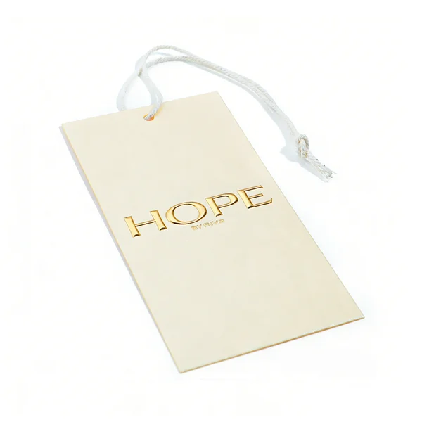 吊牌为圆角竖长方形,兼具现代美学风格与实用属性;顶部精准定位的圆形穿孔,让吊牌能轻松系挂于服饰之上。白色挂绳与金色基底形成干净明快的视觉对比,挂绳末端的轻微毛边处理,增添了一丝低调的手工质感,与当下设计师品牌的审美潮流高度契合。