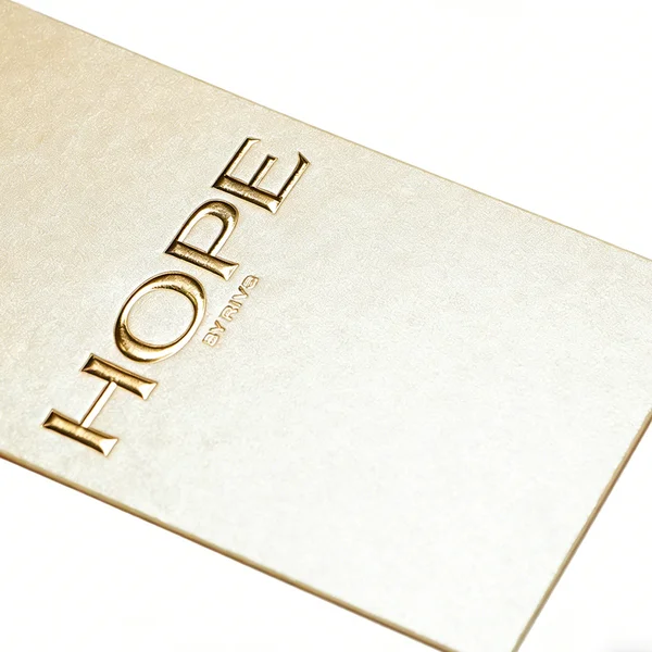 吊牌基底为浅金(香槟米色),泛着柔和的温润光泽,光影下细腻反光却不张扬刺眼。这款中性又兼具奢华感的色调,能与各类衬衫面料、色彩完美相融。品牌名 “HOPE” 以粗体大写字体居于吊牌中心,采用烫金工艺制作,打造出立体金属质感,既增强视觉层次感,又能瞬间传递高端品质;下方的 “BY RIVE” 以小号烫金字体呈现,在梳理品牌视觉层级的同时,保持整体版面的简洁利落。