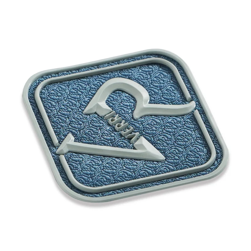 牛仔蓝织唛基底采用斜纹结构,呈现自然的纺织肌理与复古气息。表层通过高弹立体转烫工艺附着浅灰色 TPU 图案与边框,使标识在视觉与触感上形成明显层次对比。
