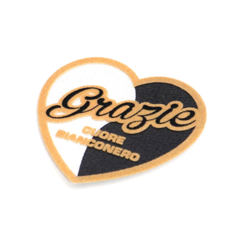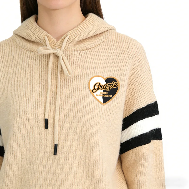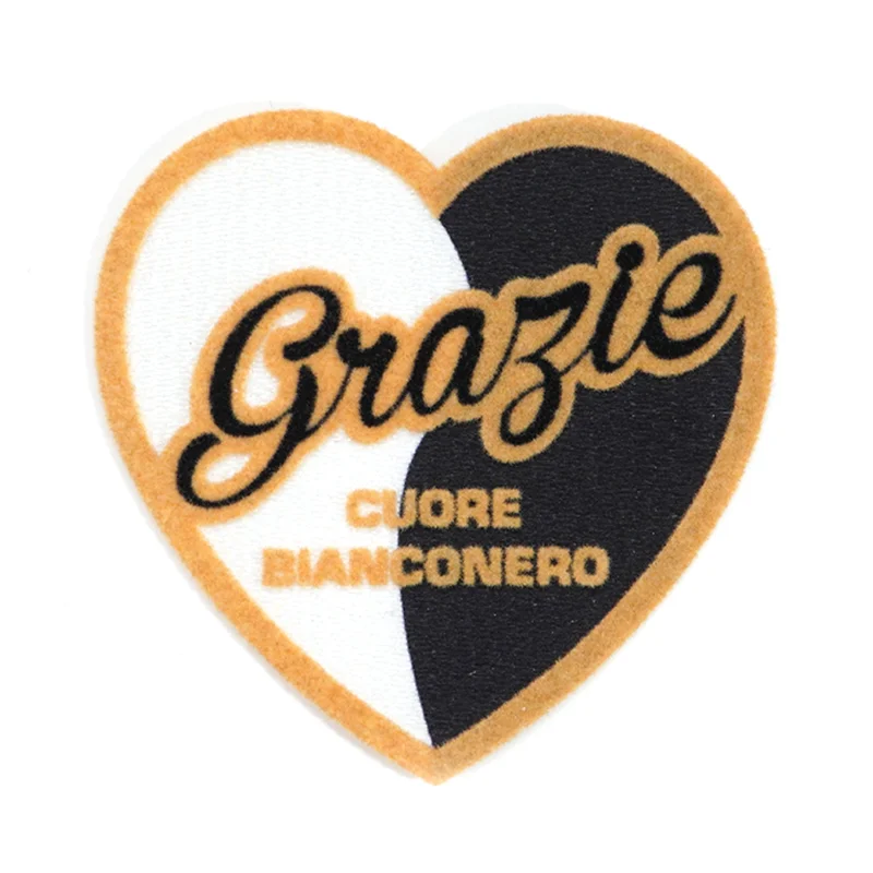 中央为大号花体字“Grazie”,黑色植绒搭配橙色轮廓,醒目优雅。下方小号无衬线文字“CUORE BIANCONERO”进一步强化球迷身份,凸显团队归属感。