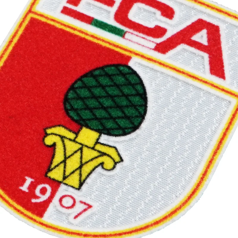 顶部白色区域中,红色植绒“FCA”字样突出显示,并加入绿白红细条点缀,提升整体设计层次,使该soccer badge patch更具特色。