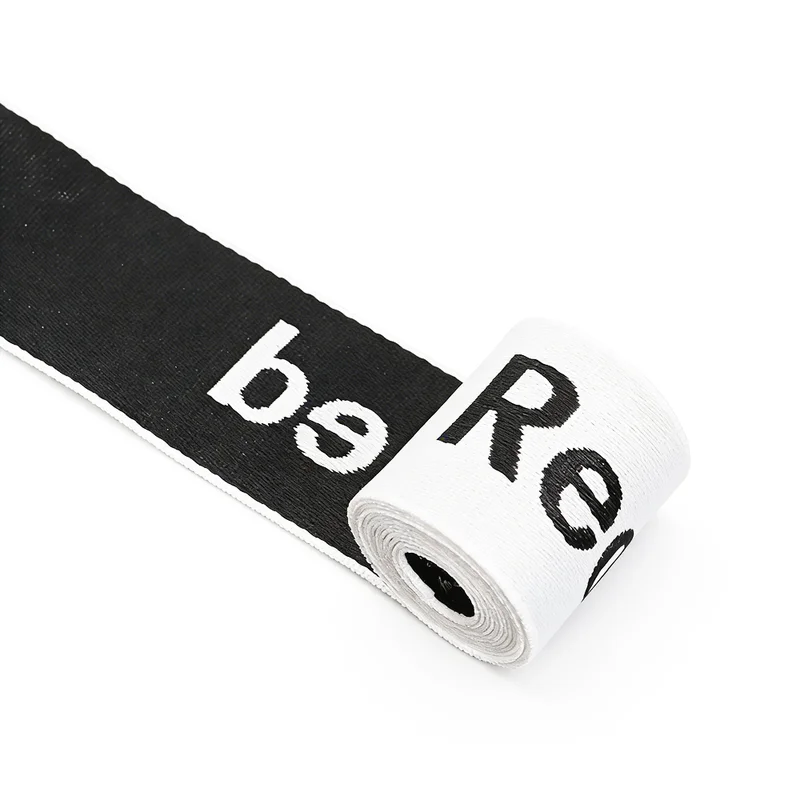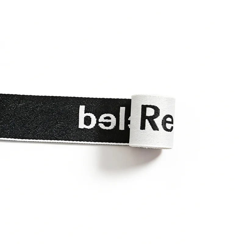 - 平铺 / 卷状展示白底黑字正面细节,清晰呈现织带纹理与字体排版;