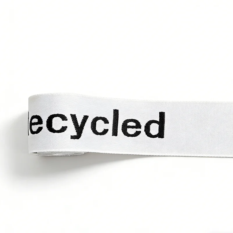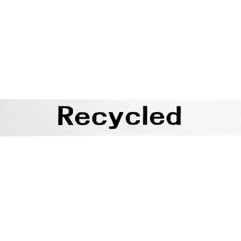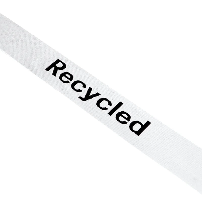 - 文字内容:核心字样为 “Recycled”(意为 “可回收的”),字体为无衬线体,边缘清晰、提花饱满,环保主题明确,适合可持续服饰、箱包等产品。